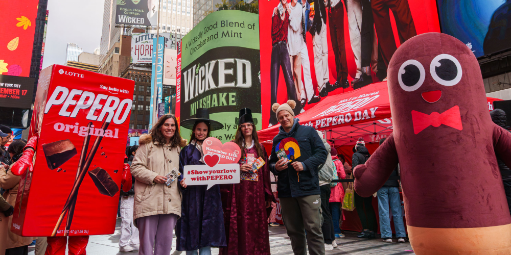 롯데웰푸드는 11월 11일(현지 시간) 미국 뉴욕 타임스스퀘어 파더 더피 스퀘어(Father Duffy Square)에서 ‘웰컴 투 K-스위트 홀리데이’ 페스티벌을 성황리에 개최했다고 12일 밝혔다. 한국의 기념일을 넘어 글로벌 나눔 문화로 확장되고 있는 ‘빼빼로데이’를 전 세계 소비자가 함께 즐길 수 있도록 기획한 행사다. 현장은 영하의 날씨임에도 수만 명의 방문객이 몰리며 빼빼로 브랜드와 한국의 빼빼로데이에 대한 높은 관심을 입증했다.