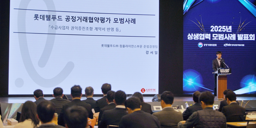 이날 행사에서 롯데웰푸드는 이러한 공로를 인정받아 우수 사례 발표 기업으로 선정됐다. 발표자로 나선 강서일 준법경영팀 매니저는 ▲수급사업자 권익증진 조항 강화 표준하도급계약서 도입 사례, ▲내부분쟁조정절차 고도화 등 롯데웰푸드만의 선진적인 상생 시스템을 소개했다.